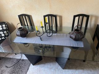 Conjunto de mesa de comedor con superficie de cristal y 6 sillas a juego. - Mesa con estructura de madera y base de cristal. - 6 sillas de comedor con respaldo alto. * se regala mesa baja a juego con el conjunto. Ver y recoger en San Cristóbal de E. No hacer ofertas ridículas el precio es el que pone.