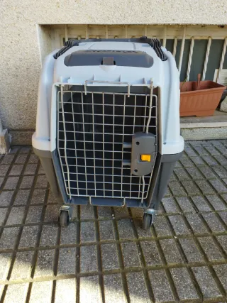 Lote de transportín para mascotas y accesorios. - Transportín de plástico y rejilla metálica. - Ruedas para facilitar el desplazamiento. - Cierre de seguridad en la puerta.