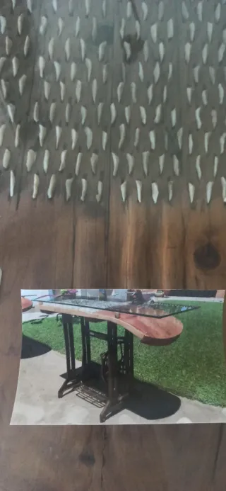 Mesa con estructura de máquina de coser antigua. - Encimera de cristal laminado - Base de madera trillo tratada y con todas las piedras - estructura maquina de coser Precio negociable