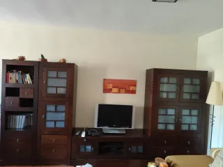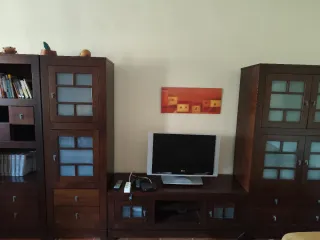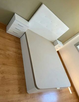 Conjunto de cabecero de madera con un diseño moderno y dos mesitas de noche a juego. - Cabecero con detalles lineales. - Mesitas de noche con enchufes integrados. Medidas: - Cabecero : 212 cm × 45cm × 3 cm grosor - 2 mesitas de noche: 48 cm ancho× 48cm alto × 36cm fondo -comoda: 98 cm ancho × 65 cm alto × 41 cm fondo.( Los dos primeros cajones, tendrías que cambiar las guías porque no cierran bien)