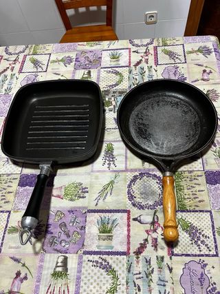 Se venden dos sartenes, una grill cuadrada y otra redonda. Hierro fundido - Sartén grill cuadrada con mangos de metal y plástico. - Sartén redonda con mango de madera.