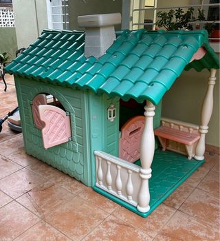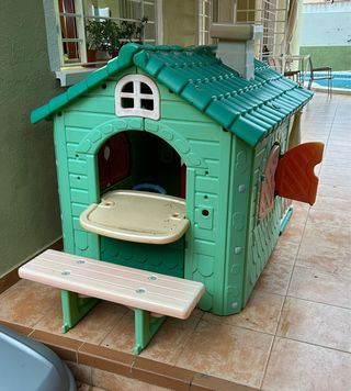 Casa de juego de plástico para exteriores, ideal para el jardín. Tiene un diseño colorido y divertido. - Techo verde con textura de tejas. - Paredes en color verde menta. - Puertas y ventanas en color naranja. - Porche con barandilla y banco.