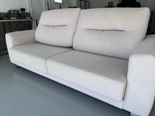 Sofá de tres plazas con tejido antimascotas. - Diseño moderno y confortable. - Patas metálicas discretas. - Medida 215x100cm. - Se hace chaisse long y sale hasta los 150cm. - Los cojines del respaldo se pueden retirar y se puede dormir en el hueco de 180x90cm. - El tejido repele líquidos y es de fácil limpieza. - Muy poco uso, comprado hace un año, se vende por mudanza.