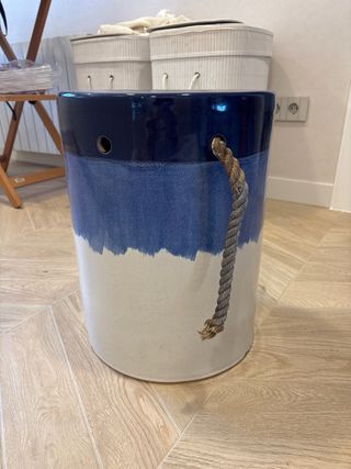 Elegante mesa cilíndrica con un diseño degradado en tonos azules y blanco. - Acabado brillante en la parte superior. - Detalle de cuerda en los laterales. - Base estable. Una cuerda se ha soltado.
