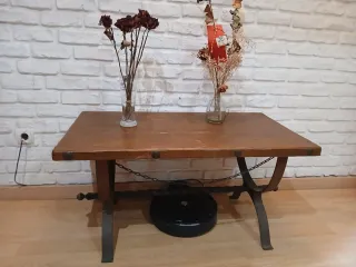 Mesa de centro con un diseño rústico y robusto, inspirada en el estilo castellano. Combina la calidez de la madera con la resistencia de la forja. - Tablero de madera maciza. - Patas y estructura de forja. - Detalles decorativos en cadena.
