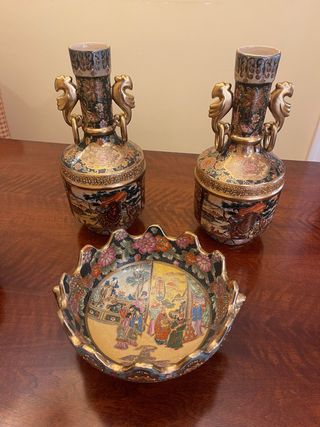 Conjunto de dos jarrones y un cuenco decorativo de estilo Satsuma. - Diseño intrincado con escenas y motivos florales. - Acabado dorado en bordes y asas. - Piezas de cerámica y porcelana.
