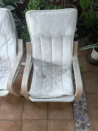 Conjunto de dos sillones modelo Poäng de Ikea. Su diseño combina una estructura de madera con cojines de tela. - Estructura de madera. - Cojines de tela.