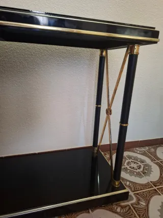 Elegante mesa auxiliar con un diseño moderno y sofisticado. - Acabado brillante en negro. - Detalles metálicos dorados. - Patas cilíndricas con soportes cruzados.