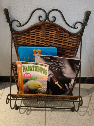 Elegante revistero de mimbre con detalles en forja. - Diseño rústico y funcional. - Ideal para organizar revistas y periódicos. - Estructura de mimbre trenzado. - Adornos decorativos en forja negra.