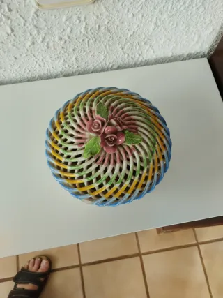 Precioso cuenco de cerámica hecho a mano con un diseño floral vibrante. - Pintura multicolor detallada. - Tapa con diseño de cesta y flor. - Borde azul y amarillo.