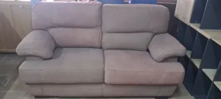 Sofá de dos plazas con un diseño moderno y confortable. Ideal para salones o salas de estar. - Tapicería de tela y ante. - Color beige y marrón.