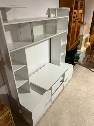 Mueble de salón en buen estado, con un diseño moderno y funcional. - Acabado en color blanco. - Amplio espacio de almacenamiento con estantes y cajones. - Incluye compartimentos con cristal. Se hacen envíos económicos