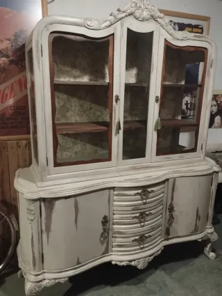 Preciosa vitrina antigua recién restaurada en un estilo shabby chic en tono claro y forrados el interior y los cajones con motivos florales haciendo un contraste muy luminoso a la vez que elegante,los desgastes y las estanterías en madera oscura hace de ella una pieza diferente y única. Restauración,antiguedades,mueble, estantería,