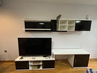 Conjunto de muebles de salón con un diseño moderno y elegante. - Combinación de acabados en negro y blanco. - Estructura principal de madera. - Detalles en cristal.
