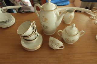 Elegante juego de café de porcelana con detalles dorados. Incluye 5 servicios completos. - Diseño floral delicado. - Acabado blanco brillante con borde dorado.