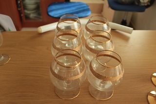 Elegante juego de copas y vasos de cristal con un delicado detalle dorado. - Diseño clásico y refinado. - Aportan un toque de distinción a cualquier ocasión.