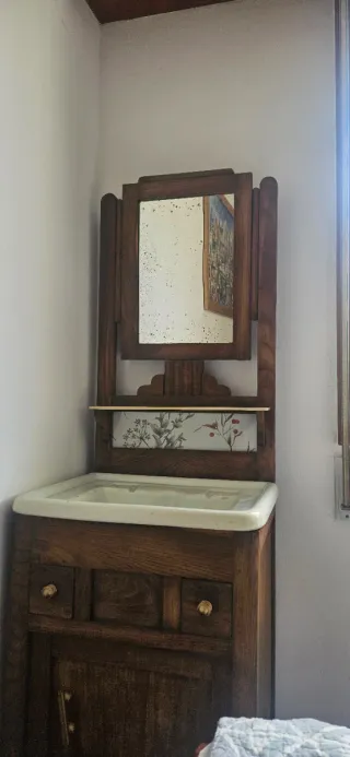 Mueble lavabo de estilo vintage con un diseño clásico.Restaurado con piezas originales - Encimera de porcelana. - Estructura de madera. - Tiradores dorados.