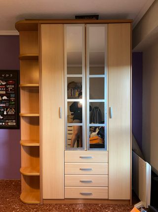 Precio completamente negociable. Armario de dos puertas con un diseño moderno y funcional. - Acabado en madera clara. - Puertas correderas con paneles de cristal. 2,40 de alto x 1,55 de ancho x 55 de profundo aproximadamente. Son dos módulos juntos, zapatero com estanteria + armario. Cuando lo montamos se nos salió un pelín de la guía y se rompió la tapa trasera un poco, esta la foto al final.