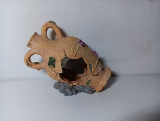 Objeto decorativo de acuario recreando ánfora antigua. Elaborado en resina plástica pintada. Apertura pasante para favorecer el paso de los peces y ofrecer zona de ocultación.