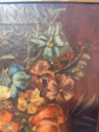 Precioso cuadro al óleo con una composición floral. Medidas con marco 62x53cm Pequeñas roturas que se ven en las fotografías. - Pintura de flores. - Marco de madera.