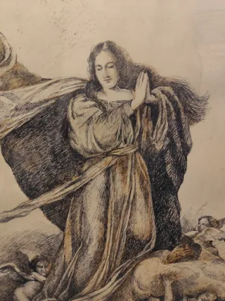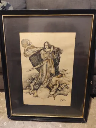 Esta es una obra de arte religiosa. Medidas con marco 70x54cm - Dibujo a tinta sobre papel. - Marco negro con detalles dorados.