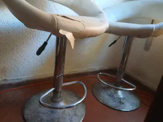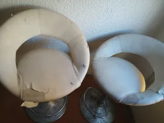 Conjunto de dos taburetes con un diseño moderno y circular. La tapicería es de piel y su color es blanco. - Palancas de subida y bajada, 1 funciona bien,la otra no. - Requieren restauración. - Base metálica. - Asiento giratorio.