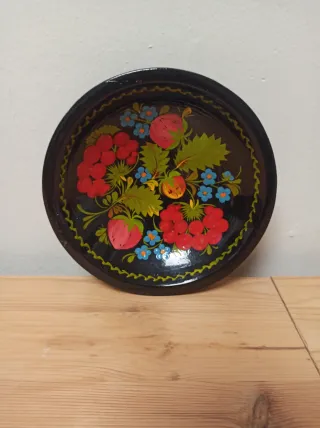 Precioso cuenco de madera pintado a mano con un diseño floral y de frutos rojos. - Pintura detallada con motivos de fresas y flores. - Borde decorado con un patrón ondulado.