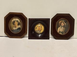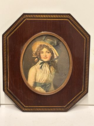Conjunto de tres marcos pequeños dos con un diseño octogonal y uno cuadrado, son de madera y marquetería de metal dorado. - Marco octogonal con retrato de mujer. - Marco cuadrado con escena de figuras. - Marco octogonal con retrato de mujer.