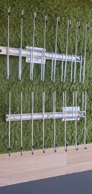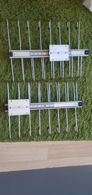 Conjunto de dos percheros extraíbles para organizar pantalones. - Cada perchero tiene 5 barras. - Fabricados en metal y plástico.