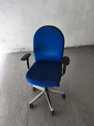 Silla de oficina giratoria con un diseño moderno y funcional. - Tapicería de tela en color azul. - Base y estructura de metal plateado. - Ruedas para fácil movilidad. -Multitud de ajusté
