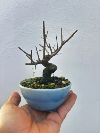 Bonsai de granado nejikan Plantado en akadama y pomice Maceta de cerámica azul craquelada