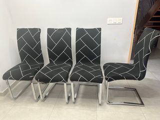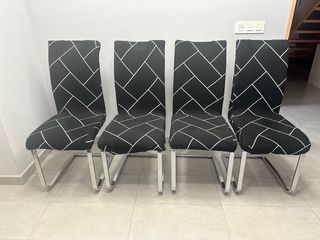 **para tapizar**Conjunto de cuatro sillas con un diseño moderno y elegante, perfectas para cualquier comedor o espacio. - Fundas con estampado geométrico en blanco y negro. (8 unidades) - Patas de metal cromado en forma de U.