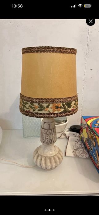 Lámpara de mesa con un diseño vintage y un acabado en color beige. Su pantalla tiene una cinta decorativa con motivos florales. - Pantalla de tela. - Base de madera tallada.