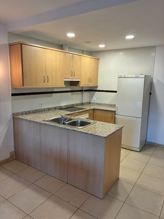 Conjunto de cocina con muebles de madera y encimera de piedra. - Muebles de cocina superiores e inferiores. - Encimera de granito con fregadero doble. - Electrodomésticos incluidos: frigorífico, placa de cocina, horno y extractor