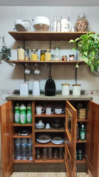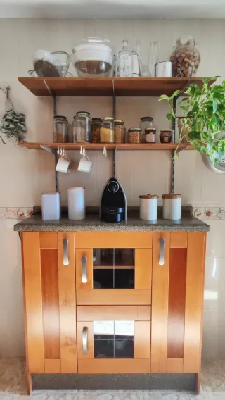 Mueble auxiliar de cocina, madera de cerezo, dos vitrinas, encimera y zócalo de granito doble canto. Guías y dos baldas en tablero marino. Ideal como mueble desayunador. Una de las puertas tiene en su interior 5 pequeños agujeros de tornillo reparados con masilla.