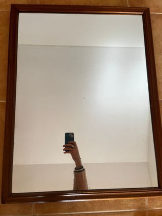 Elegante espejo de estilo clásico con marco de madera. 76x58.5cm. Pesa mucho! Muy buen estado. Recoger en Binissalem o posibilidad de quedar en algún punto pero sólo para alguien serio. Tengo para vender en mi perfil un cuadro del mismo estilo y altura que este espejo. Very heavy large mirror with classic wooden frame. Very good condition. Collect in Binissalem or possibly of arranging to meet somewhere. You can see a large painting for sale on my profile, same height, would go well beside this mirror.