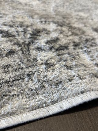 Alfombra de Zara Home con diseño Vintage 100% Viscosa de pelo corto efecto plateado y aterciopelado. Sus dimensiones son 230 largo x158 cm de ancho. El color es tipo grisáceo blanco y con un efecto plata. Lo bueno que tiene es que se puede meter en la lavadora. (Yo tengo una de 10 Kg y se lava perfectamente) Lleva un tiempo guardada porque aunque queda muy cálido... soy un poco maniática y me he dado cuenta que me da mucho trabajo tenerla impecable. (Sacudirla para el polvo..., mantenerla limpia y desinfectada...) en fin, la guardé y ahora espera un nuevo hogar. ¡Activo el envío!