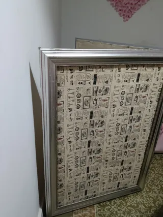 Biombo decorativo con un diseño inspirado en periódicos antiguos y elementos vintage. - Marco plateado con detalles. - Diseño de fondo con texto y dibujos de llaves y tijeras.