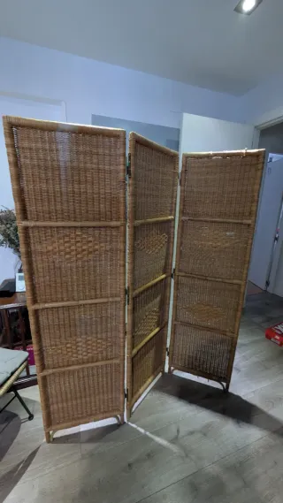 Biombo decorativo de tres hojas con un diseño de mimbre trenzado. Esta en muy buen estado con ninguna mancha o rotura. Altura 174cms Cada hoja mide 40cm de ancho - Material: Mimbre. - Número de hojas: 3. - Estilo: Trenzado.