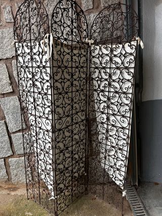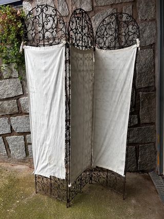Elegante biombo de forja con paneles de tela. - Diseño ornamental en forja. - Paneles de tela blanca. - Estructura de metal resistente.