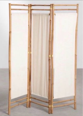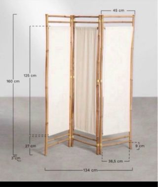 Biombo Bambú y Lona Blanca Biombo decorativo con estructura de bambú y paneles de lona blanca. - Material: Bambú y lona. - Diseño de tres paneles. - Ideal para separar ambientes. Complemento decorativo de Bambú. Material 100% ecológico y sostenible. Accesorio perfecto para tu salón o dormitorio, con el que podrás diferenciar zonas y separar ambientes. Acabados naturales y sin tratamientos químicos, conservando las irregularidades del propio material. Características: * Colores: Bambú * Uso: Interior * Requiere montaje :No * Material: Lona y Bambú Medidas: * Alto :160 cm * Ancho:134 cm * Profundo:38 cm