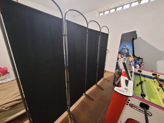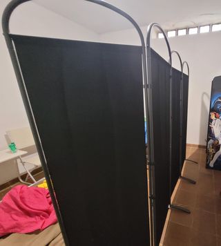 Biombo de metal desmontable, con tres paneles de tela (las he lavado pero quizá les vendría bien un poco de plancha ^^' Lo hubiera hecho pero no tengo en casa.)