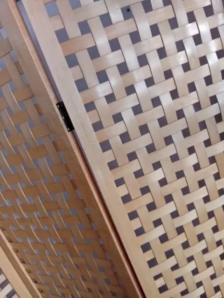 Este biombo de madera es perfecto para dividir espacios o añadir un toque decorativo. Tiene tres partes de 40cm que se plegan con bisagras como se ve en la imagen y una altura de 172cm. Recoger en Alcorcón. - Material: Madera - Diseño: Trenzado - Color: Natural