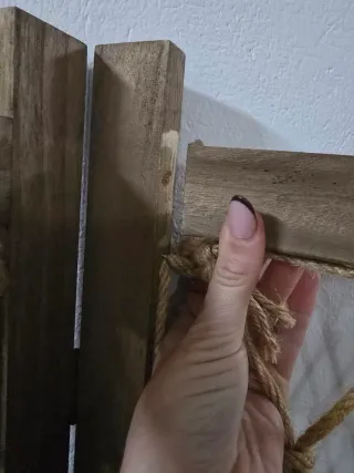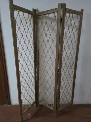 Pack de 2 Biombos decorativos de madera con un diseño de red de cuerda. - Estructura de madera. - Panel con cuerda entretejida en rombos. -Tamaño: 170 de alto x 40 cm de ancho cada pieza. Total estirado 90 cm. -Con una lamina despegada, por el resto, en perfectas condiciones