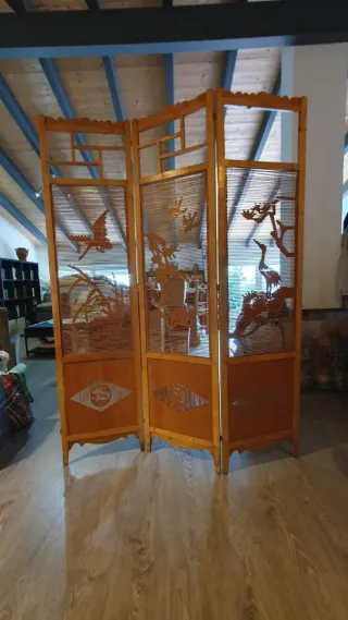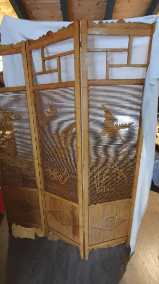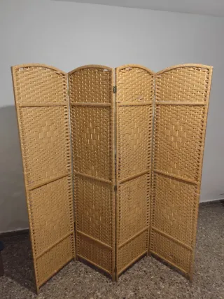 Vendo biombo vintage de madera maciza con paneles de rejilla natural (mimbre/canea), muy sólido y decorativo. ✔️ 4 hojas ✔️ Altura aprox. 1,90 m ✔️ Ancho total desplegado aprox. 2 m ✔️ Estilo clásico / vintage (años 60–70 aprox.) ✔️ Estructura firme, madera en buen estado ✔️ Rejilla original bien conservada Ideal para separar ambientes, dormitorios, salones, estudios, locales, casas rurales o decoración interiorista. Se puede ver sin compromiso. Recogida en mano en Alicante. Precio negociable dentro de lo razonable.