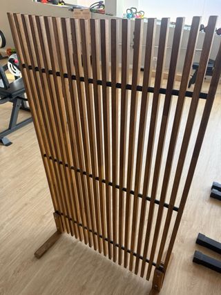 Biombo separador de madera con un diseño moderno y elegante. Perfecto para separar estancias. Como nuevo. - Estructura de listones de madera. - Barras de sujeción negras.