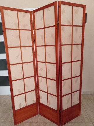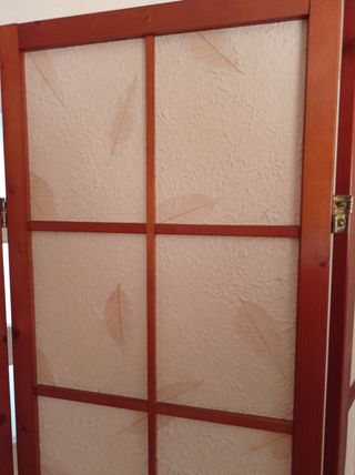 Preciosa pantalla plegable de estilo japonés. Está en perfecto estado. - Estructura de madera. - Tres hojas de 180 cm de alto por 45 cm (cada hoja) - Papel decorado con motivos de plumas.