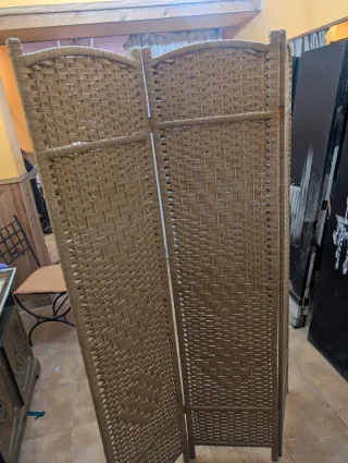 Bonito biombo o parabán de madera y bambú. El marco es de madera maciza con base robusta para soportar con firmeza e impidir que se venza. Muy útil para separar dos ambientes o simplemente para decorar una pared. Está bien conservado y ofrezco buen precio ya que cuando lo compré en la tienda "Rústiko" me costó 400 €. No se hace envío, solo venta en persona.