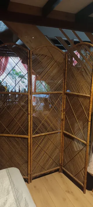 En realidad son dos, uno de dos hojas y otro de tres , ideal para separar ambientes o decorar. Está hecha de mimbre trenzado y tiene un diseño elegante y artesanal. - Medidas aproximadas: (Añadir medidas si se conocen) - Perfecto estado de conservación.