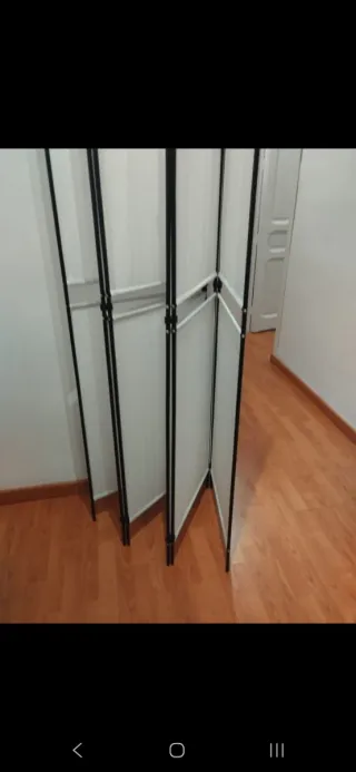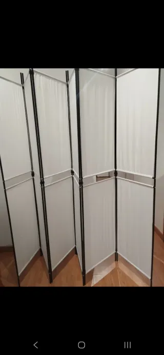 Biombo con estructura metálica negra y paneles de tela blanca. Se puede separar. - Ideal para dividir espacios. - Diseño moderno y ligero. - Fácil de montar y desmontar.